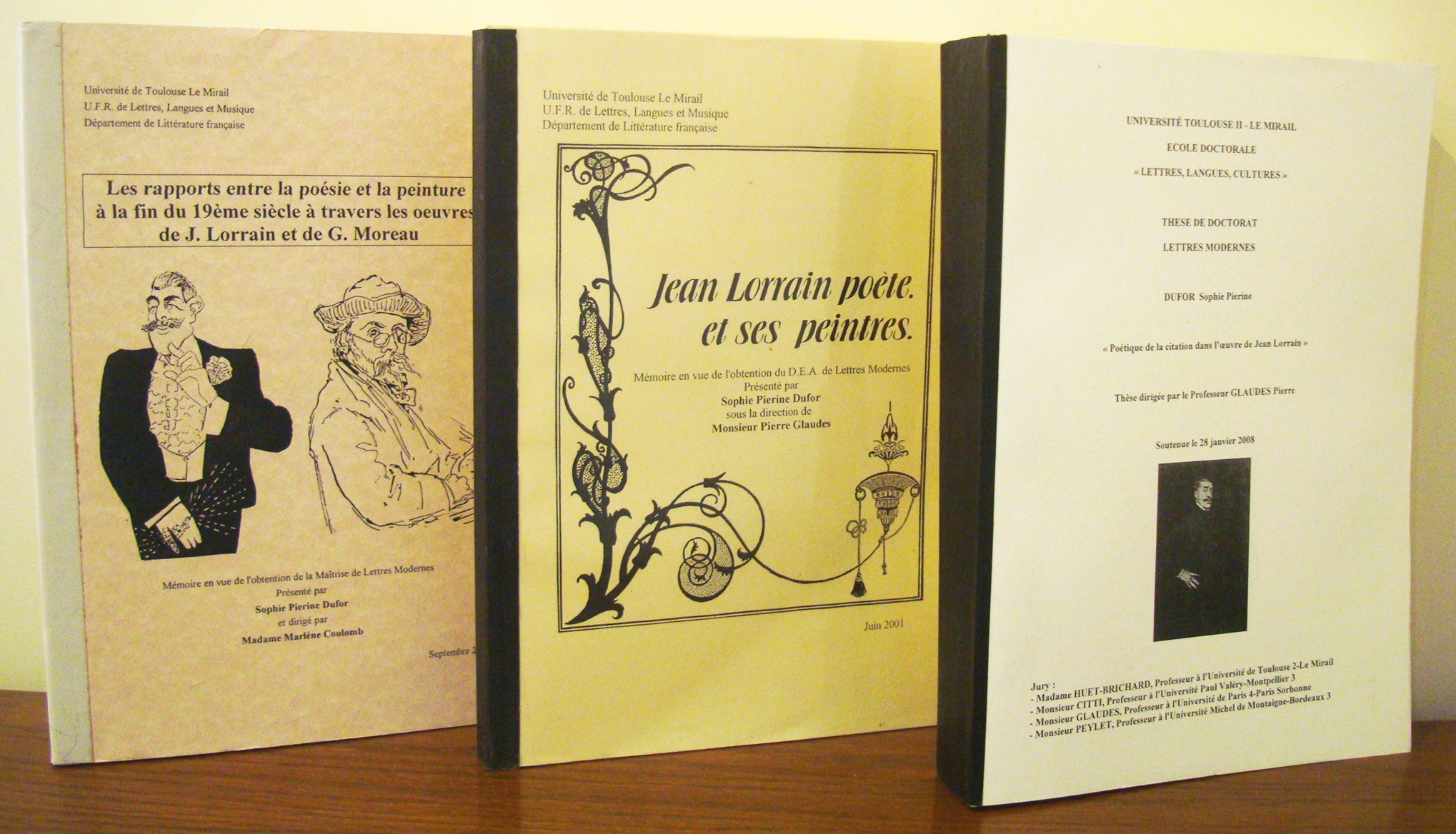 « Les rapports entre la poésie et la peinture à la fin du 19ème siècle à travers les œuvres de J. Lorrain et de G. Moreau » Université Toulouse II, 2000, Maîtrise en Lettres Modernes sous la direction de Marlène Coulomb